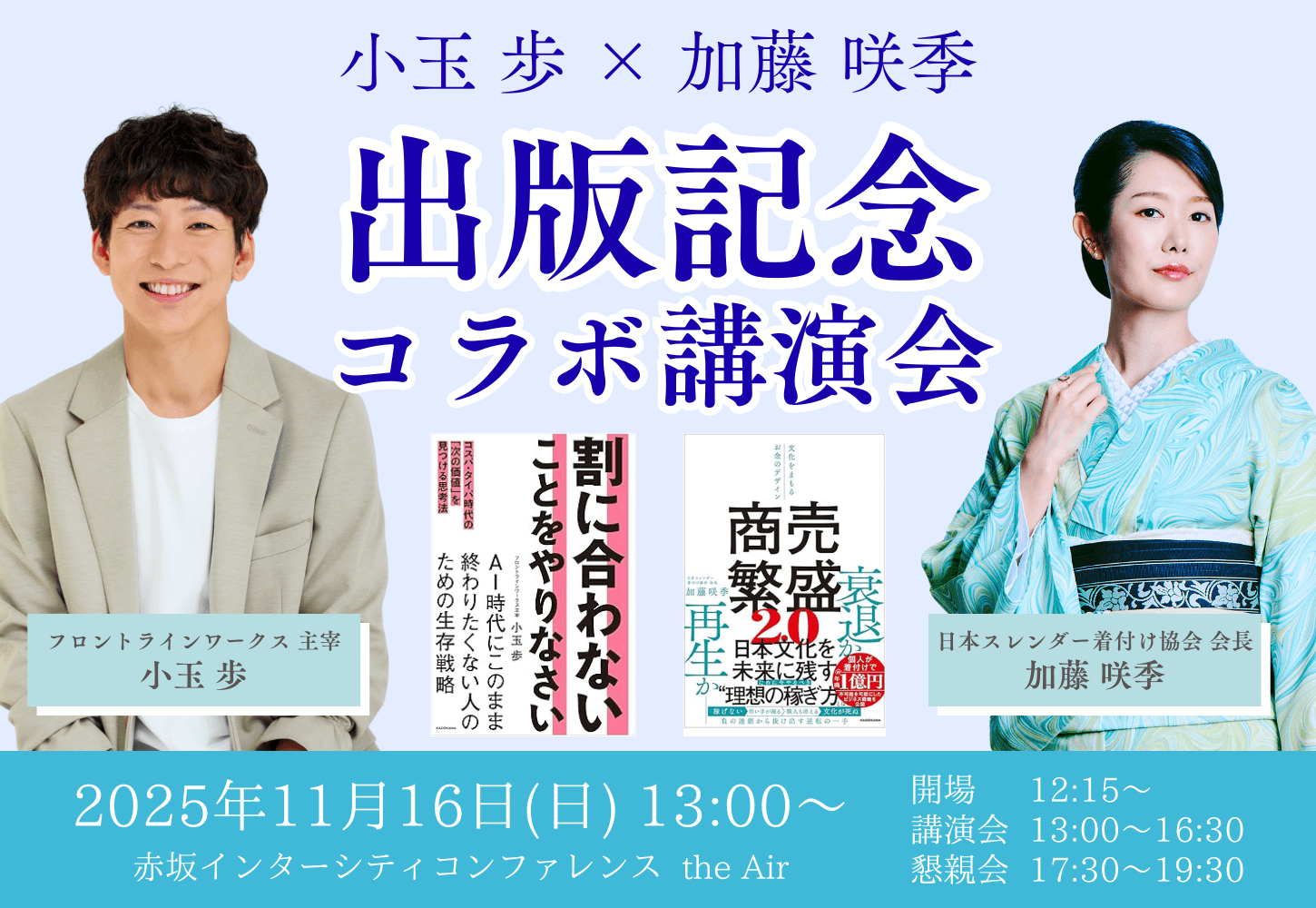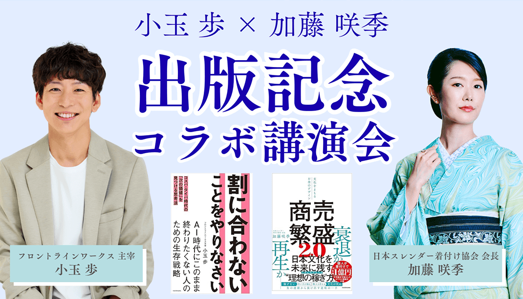 ビジネスコミュニティーを主宰し、音楽、絵画、料理、ペット、美容、自己啓発、語学、ハンドメイド、スポーツなど、様々な分野での成功者を生み出し続けるマーケッター小玉歩と、着付けというニッチな世界で個人で年商1億円を売り上げる着付け講師 加藤咲季。